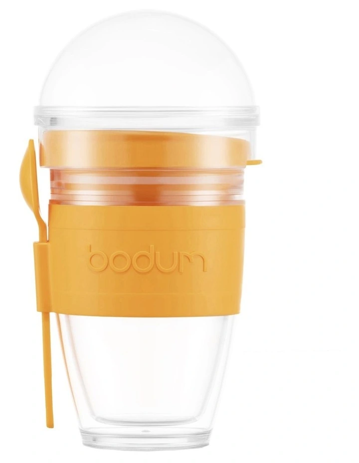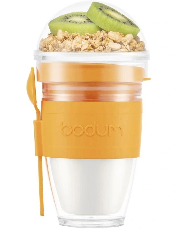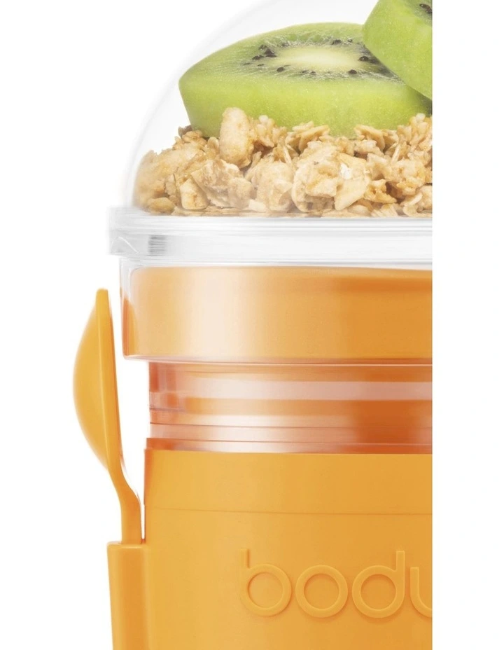 This handy snack cupΒ keeps dry and wet ingredients separate until you’re ready to eatΒ say goodbye to soaked granola or soft fruit!Β Keep your milk or yogurt fresh in the large double-walled glass, while the smart cupola ensures that the granola, fruit and other toppings stay crispy and vibrant on top.Β The contents are kept secure with a silicone seal until you feel hungry.Β Then mix it with the clip-on spoon and eat!