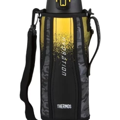 Thermos vacuum insulation technology for maximum temperature retention, keep cold up to 24 hours; Durable stainless steel interior & exterior; Sweat proof design won’t leave water rings; Drink Lid with hygienic cover and easy push button that can be locked; Pouch with strap to carry bottle; Capacity: 1.5L